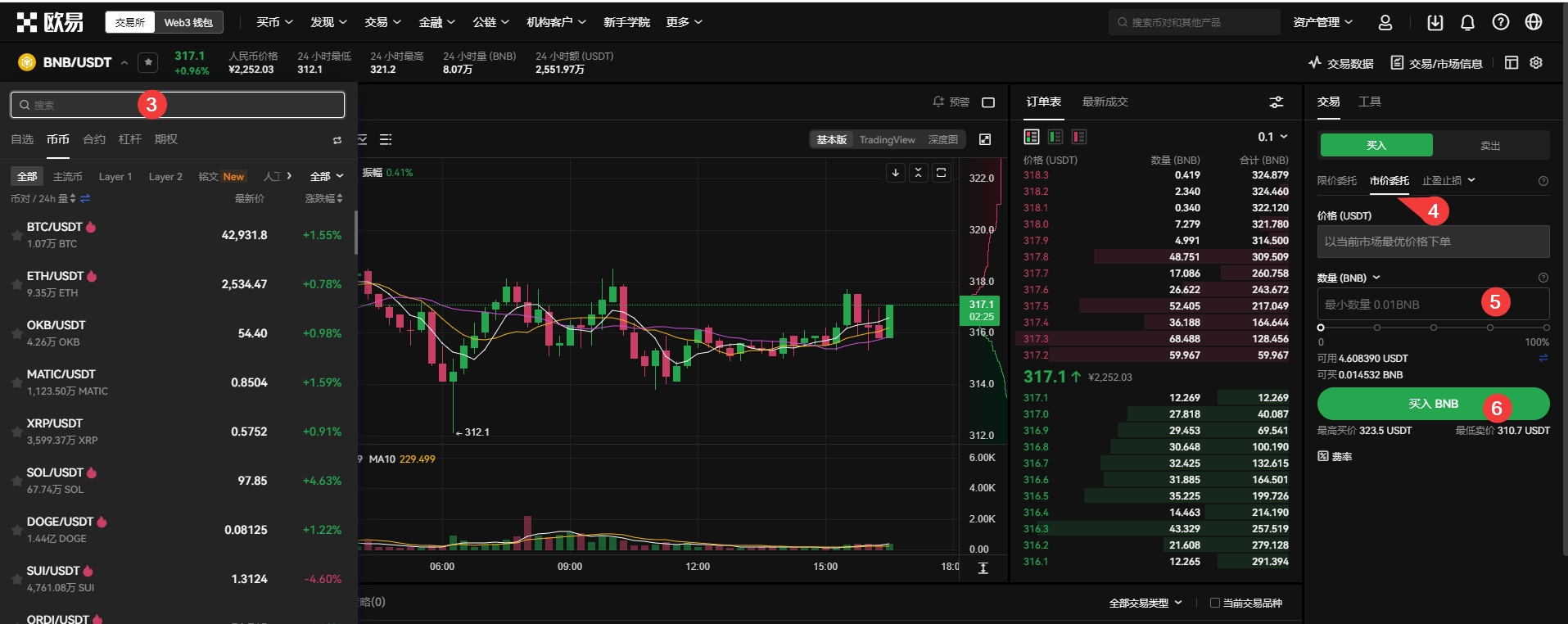 2、进入到交易页面,先用交易所中的资产买入所需的币种,先搜索币种,点击市价,输入数量,点击买入,如果一直提示没有资产,那就换成卖出,买卖完成之后就可以进行提币了。