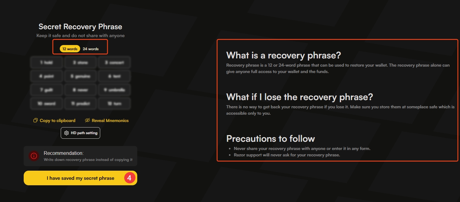 3、助记词可以选12或者24的,助记词要保存好,助记词要保存好,助记词要保存好,重要的事情说三遍,建议手写,保存之后点击I have saved my secret phase