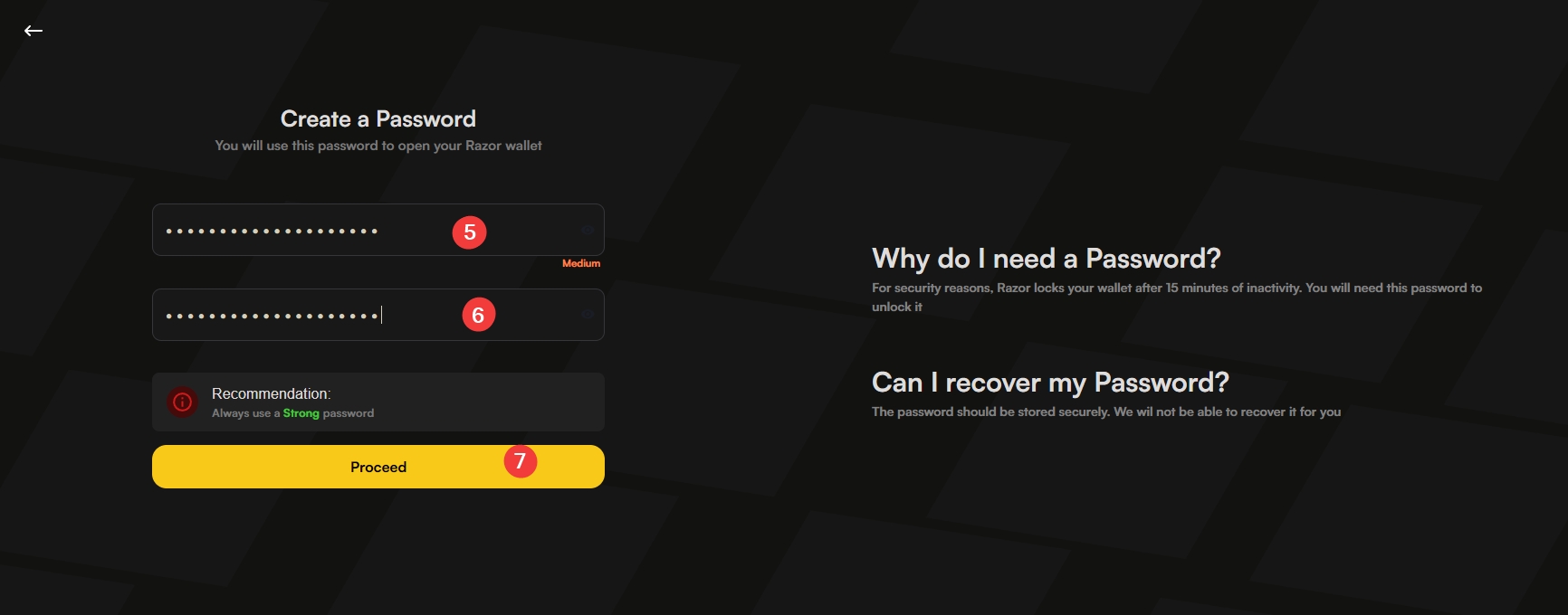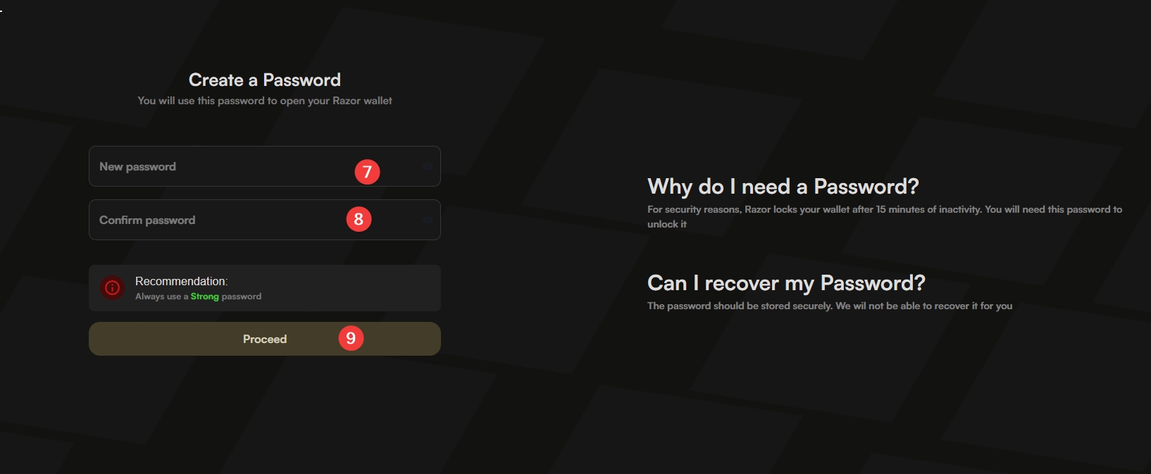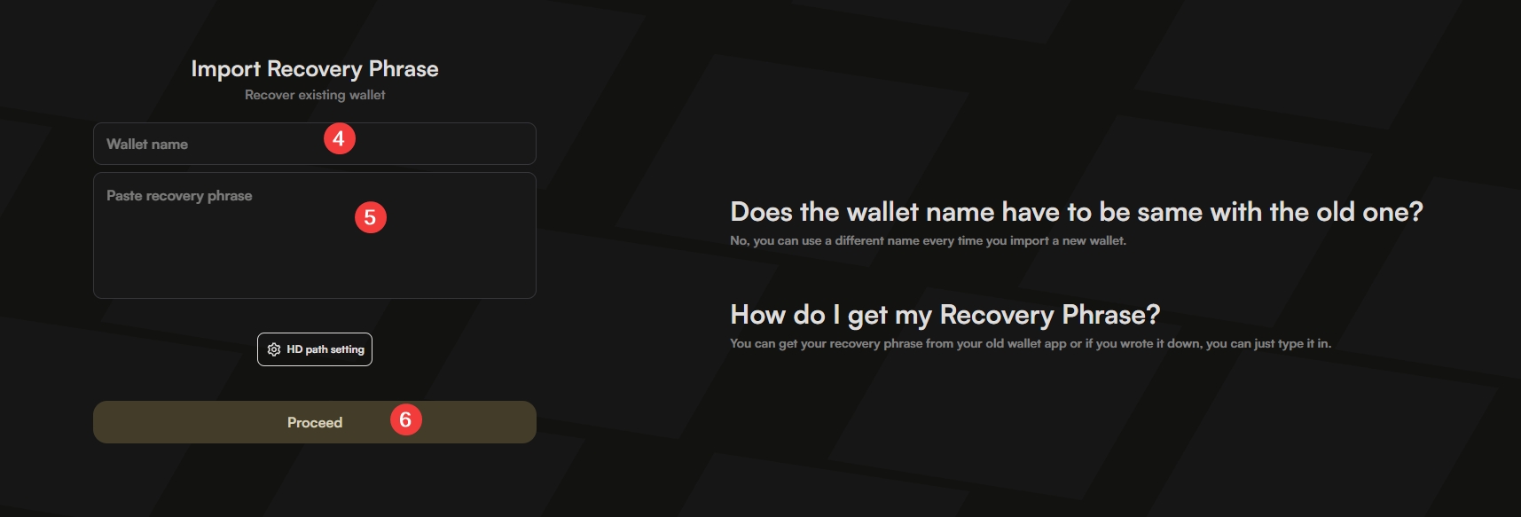 3、点击使用助记词,填写钱包名称,输入助记词,点击proceed。