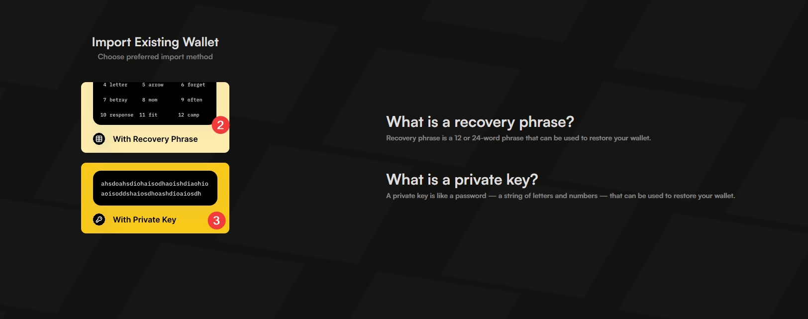 2、首选使用助记词进行导入,也可直接使用秘钥导入。