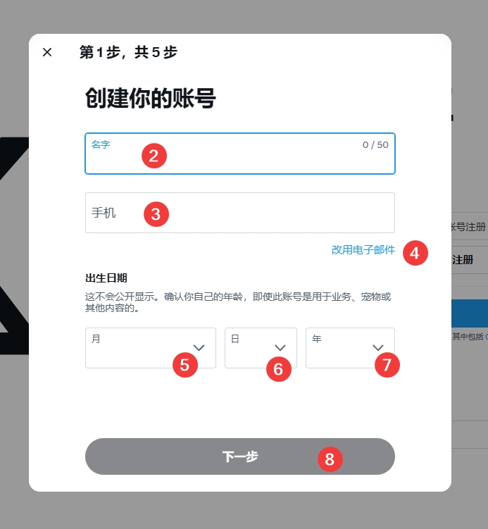 2、填写名称,建议使用电子邮箱创建,选择年月日,尽量往大点选择,点击下一步。