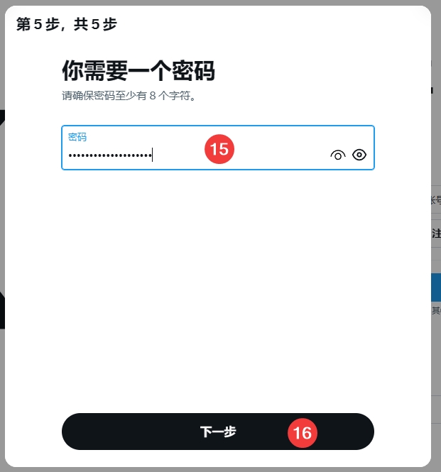 8、输入密码,点击下一步,即可创建成功,创建成功后,页面上会有一些需要你创建的名称与用户名,如果暂时不想填写点击跳过,或根据提示指引完成即可。