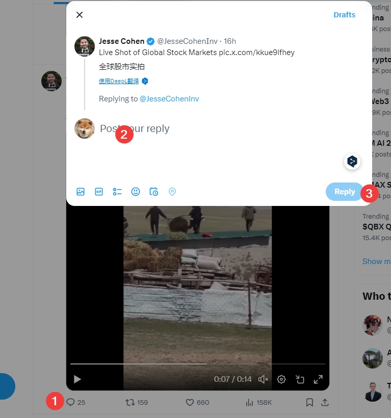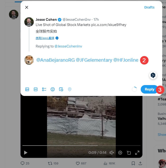 5、如何@三位好友,选择一条推文,点击信息图标,在弹窗中,输入好友的用户名,或者直接复制好友的用户进去,点击Reply